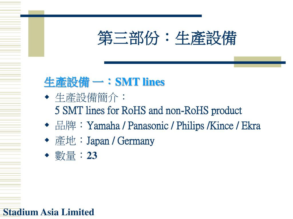 第三部份︰生產設備 生產設備 一:SMT lines • 生產設備簡介︰5 SMT lines for RoHS and non-RoHS product • 品牌︰Yamaha / Panasonic / Philips /Kince / Ekra • 產地︰Japan / Germany • 數量︰23 Stadium Asia Limited