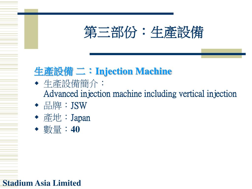 第三部份︰生產設備 生產設備 二:Injection Machine • 生產設備簡介︰Advanced injection machine including vertical injection • 品牌︰JSW • 產地︰Japan • 數量︰40 Stadium Asia Limited