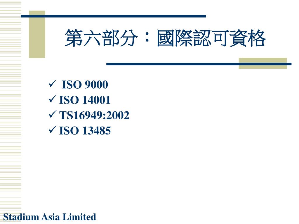 第六部分:國際認可資格 • ISO 9000 • ISO 14001 • TS16949:2002 • ISO 13485 Stadium Asia Limited