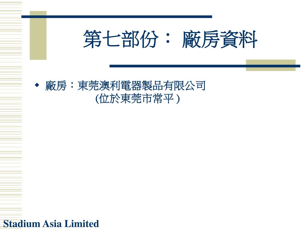 第七部份: 廠房資料 • 廠房︰東莞澳利電器製品有限公司 (位於東莞市常平 ) Stadium Asia Limited