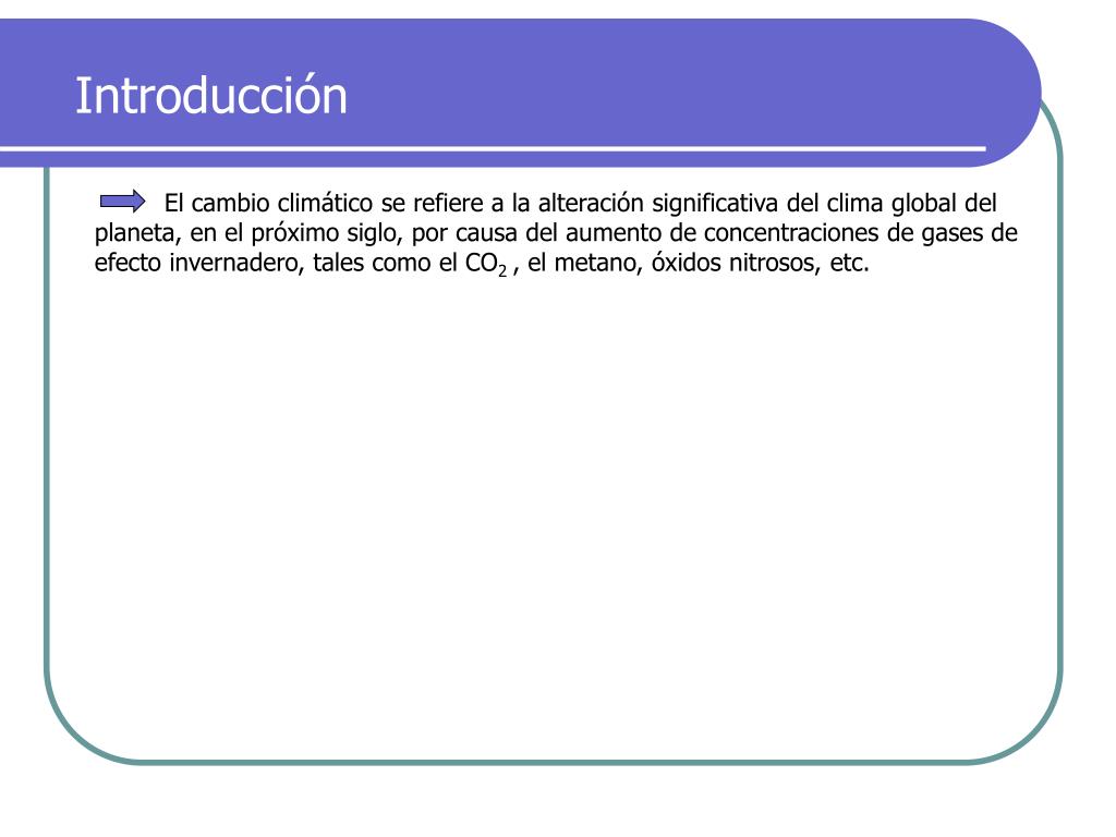Introducción El cambio climático se refiere a la alteración significativa del clima global del planeta, en el próximo siglo, por causa del aumento de concentraciones de gases de efecto invernadero, tales como el CO2 , el metano, óxidos nitrosos, etc.