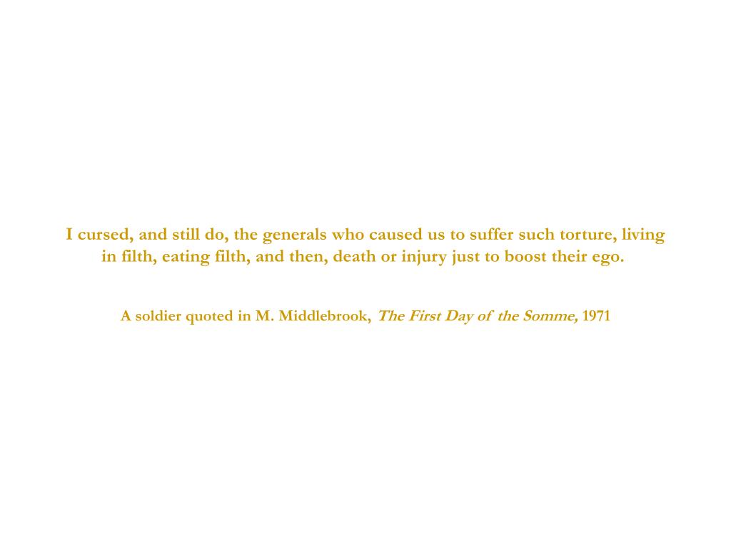I cursed, and still do, the generals who caused us to suffer such torture, living in filth, eating filth, and then, death or injury just to boost their ego. A soldier quoted in M. Middlebrook,The First Day of the Somme, 1971