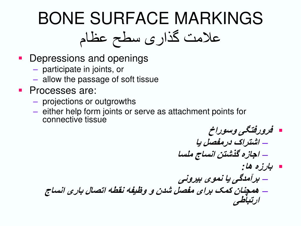 BONE SURFACE MARKINGSعلامت گذاری سطح عظام • Depressions and openings • participate in joints, or • allow the passage of soft tissue • Processes are: • projections or outgrowths • either help form joints or serve as attachment points for connective tissue • فرورفتگی وسوراخ • اشتراک درمفصل یا • اجازه گذشتن انساج ملسا • بارزه ها: • برآمدگی یا نموی بیرونی • همچنان کمک برای مفصل شدن و وظیفه نقطه اتصال باری انساج ارتباطی