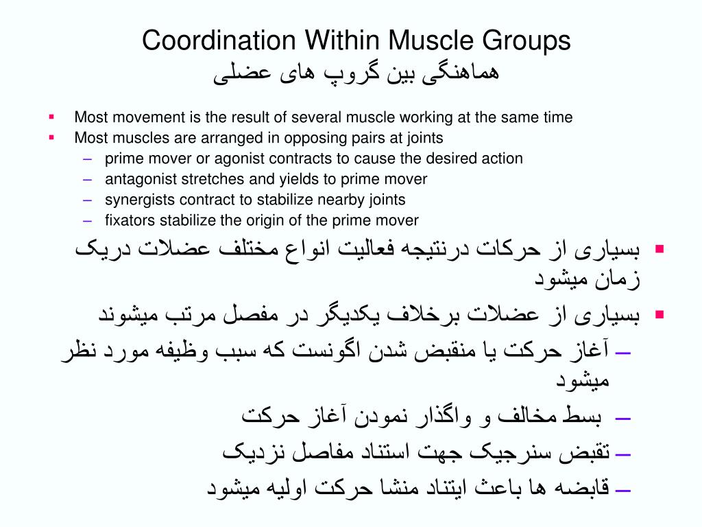 Coordination Within Muscle Groupsهماهنگی بین گروپ های عضلی • Most movement is the result of several muscle working at the same time • Most muscles are arranged in opposing pairs at joints • prime mover or agonist contracts to cause the desired action • antagonist stretches and yields to prime mover • synergists contract to stabilize nearby joints • fixators stabilize the origin of the prime mover • بسیاری از حرکات درنتیجه فعالیت انواع مختلف عضلات دریک زمان میشود • بسیاری از عضلات برخلاف یکدیگر در مفصل مرتب میشوند • آغاز حرکت یا منقبض شدن اگونست که سبب وظیفه مورد نظر میشود • بسط مخالف و واگذار نمودن آغاز حرکت • تقبض سنرجیک جهت استناد مفاصل نزدیک • قابضه ها باعث ایتناد منشا حرکت اولیه میشود