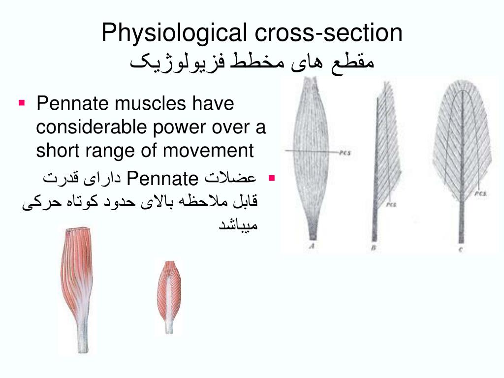 Pennate muscles have considerable power over a short range of movement عضلات Pennate دارای قدرت قابل ملاحظه بالای حدود کوتاه حرکی میباشد Physiological cross-sectionمقطع های مخطط فزیولوژیک