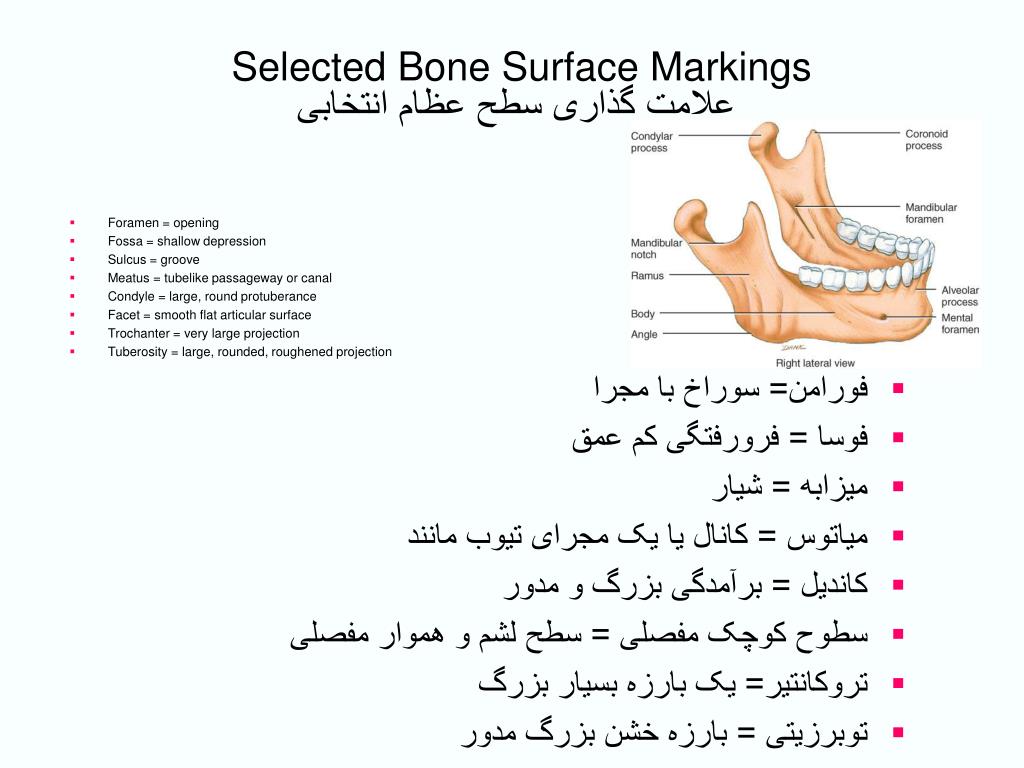 Selected Bone Surface Markingsعلامت گذاری سطح عظام انتخابی • Foramen = opening • Fossa = shallow depression • Sulcus = groove • Meatus = tubelike passageway or canal • Condyle = large, round protuberance • Facet = smooth flat articular surface • Trochanter = very large projection • Tuberosity = large, rounded, roughened projection • فورامن= سوراخ با مجرا • فوسا = فرورفتگی کم عمق • میزابه = شیار • میاتوس = کانال یا یک مجرای تیوب مانند • کاندیل = برآمدگی بزرگ و مدور • سطوح کوچک مفصلی = سطح لشم و هموار مفصلی • تروکانتیر= یک بارزه بسیار بزرگ • توبرزیتی = بارزه خشن بزرگ مدور