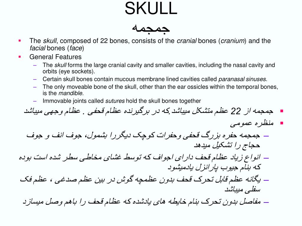 SKULLجمجمه • The skull, composed of 22 bones, consists of the cranial bones (cranium) and the facial bones (face) • General Features • The skull forms the large cranial cavity and smaller cavities, including the nasal cavity and orbits (eye sockets). • Certain skull bones contain mucous membrane lined cavities called paranasal sinuses. • The only moveable bone of the skull, other than the ear ossicles within the temporal bones, is the mandible. • Immovable joints called sutures hold the skull bones together • جمجمه از 22 عظم متشکل میباشد.که در برگیرنده عظام قحفی . عظام وجهی میباشد • منظره عمومی • جمجمه حفره بزرگ قحفی وحفرات کوچک دیگررا بشمول، جوف انف و جوف حجاج را تشکیل میدهد • انواع زیاد عظام قحف دارای اجواف که توسط غشای مخاطی سطر شده است بوده که بنام جیوب پارانزل یادمیشود • یگانه عظم قابل تحرک قحف بدون عظمچه گوش در بین عظم صدغی ، عظم فک سفلی میباشد • مفاصل بدون تحرک بنام خایطه های یادشده که عظام قحف را باهم وصل میسازد