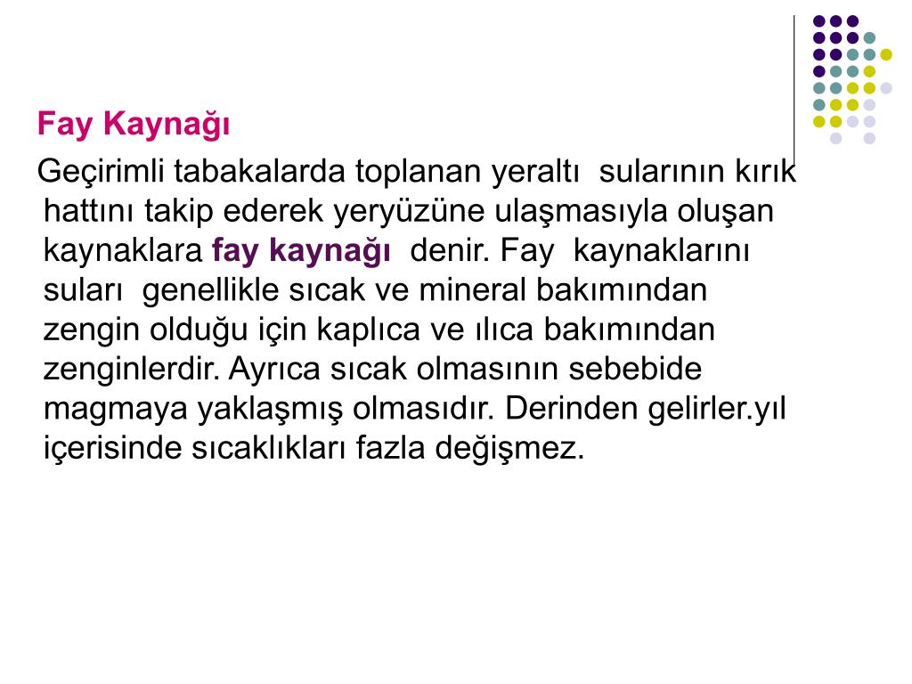 Fay Kaynağı Geçirimli tabakalarda toplanan yeraltı sularının kırık hattını takip ederek yeryüzüne ulaşmasıyla oluşan kaynaklara fay kaynağı denir. Fay kaynaklarını suları genellikle sıcak ve mineral bakımından zengin olduğu için kaplıca ve ılıca bakımından zenginlerdir. Ayrıca sıcak olmasının sebebide magmaya yaklaşmış olmasıdır. Derinden gelirler.yıl içerisinde sıcaklıkları fazla değişmez.