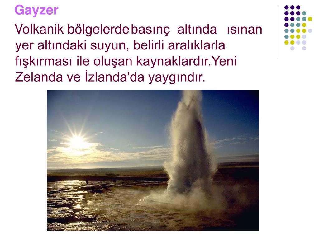 Gayzer Volkanik bölgelerde basınç altında ısınan yer altındaki suyun, belirli aralıklarla fışkırması ile oluşan kaynaklardır.Yeni Zelanda ve İzlanda'da yaygındır.