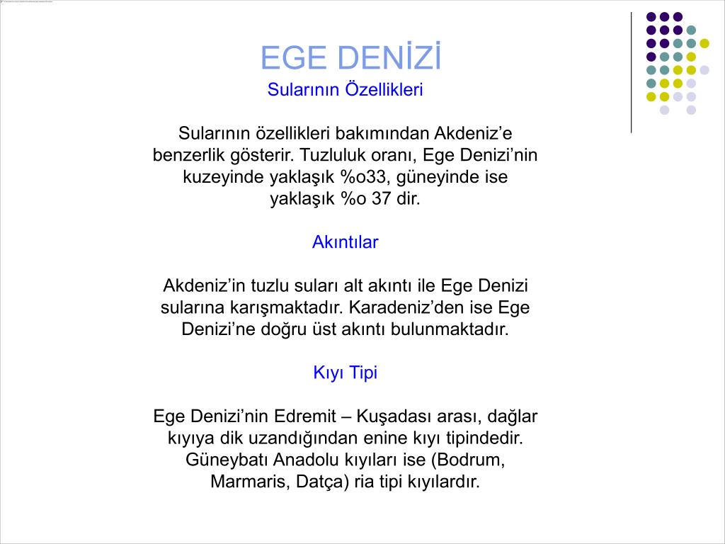 EGE DENİZİ Sularının Özellikleri Sularının özellikleri bakımından Akdeniz’e benzerlik gösterir. Tuzluluk oranı, Ege Denizi’nin kuzeyinde yaklaşık %o33, güneyinde ise yaklaşık %o 37 dir. Akıntılar Akdeniz’in tuzlu suları alt akıntı ile Ege Denizi sularına karışmaktadır. Karadeniz’den ise Ege Denizi’ne doğru üst akıntı bulunmaktadır. Kıyı Tipi Ege Denizi’nin Edremit – Kuşadası arası, dağlar kıyıya dik uzandığından enine kıyı tipindedir. Güneybatı Anadolu kıyıları ise (Bodrum, Marmaris, Datça) ria tipi kıyılardır.