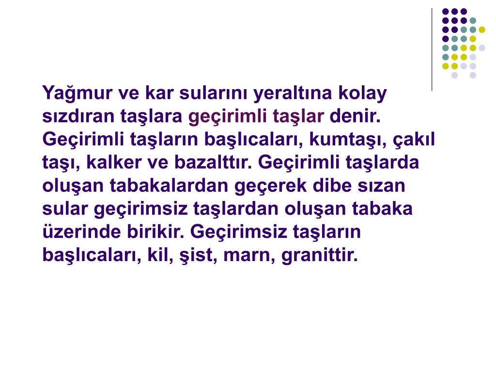 Yağmur ve kar sularını yeraltına kolay sızdıran taşlara geçirimli taşlar denir. Geçirimli taşların başlıcaları, kumtaşı, çakıl taşı, kalker ve bazalttır. Geçirimli taşlarda oluşan tabakalardan geçerek dibe sızan sular geçirimsiz taşlardan oluşan tabaka üzerinde birikir. Geçirimsiz taşların başlıcaları, kil, şist, marn, granittir.