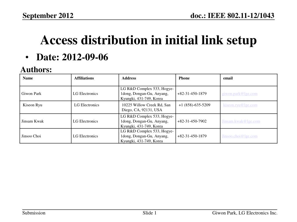 Access distribution in initial link setup Authors: • Date: 2012-09-06 Giwon Park, LG Electronics Inc.