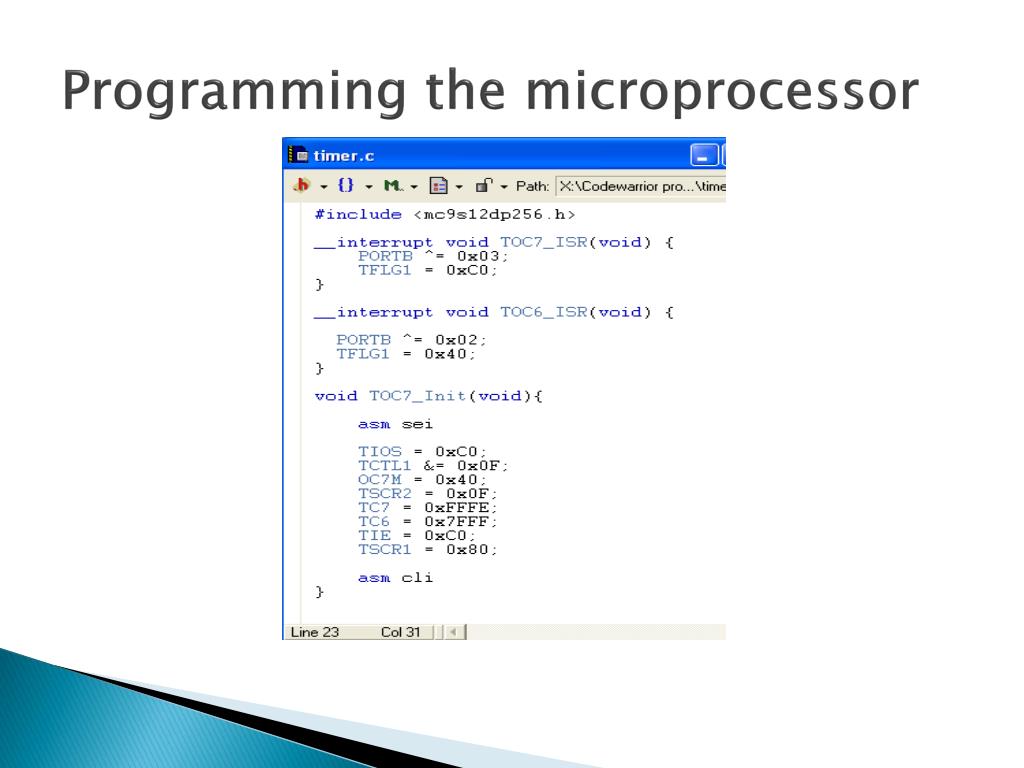 microprocessor • Receives signals from the transistor output of the IP camera • Translates the signals • Sends translated signals to steering box and speed control • Programmed with C and Assembly • Written, debugged, tested using CodeWarrior and a Dragon12 development board