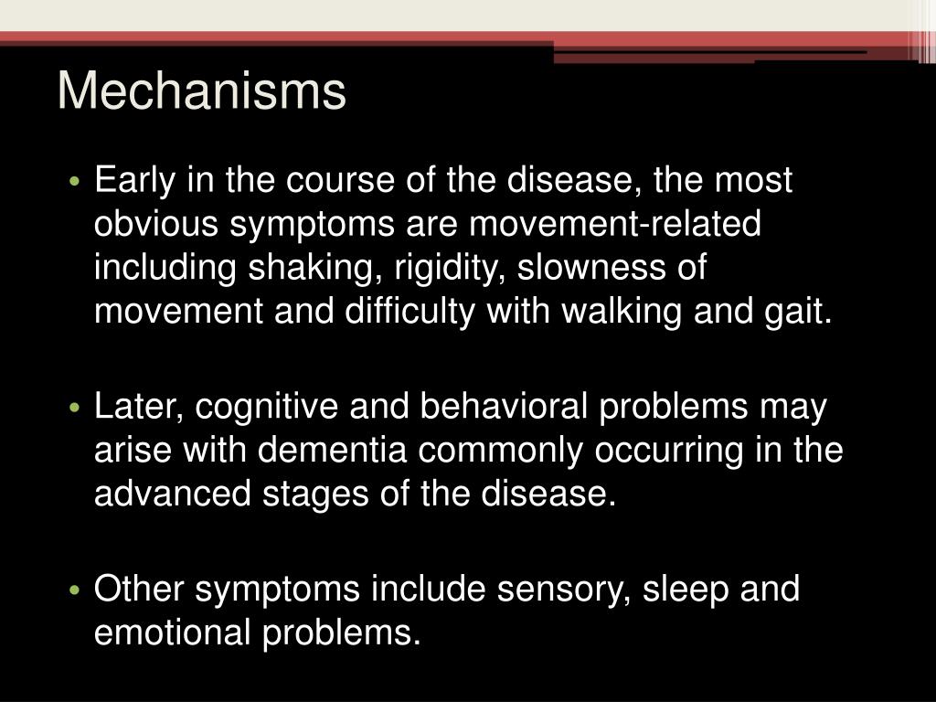 Mechanisms • Early in the course of the disease, the most obvious symptoms are movement-related including shaking, rigidity, slowness of movement and difficulty with walking and gait. • Later, cognitive and behavioral problems may arise with dementia commonly occurring in the advanced stages of the disease. • Other symptoms include sensory, sleep and emotional problems.