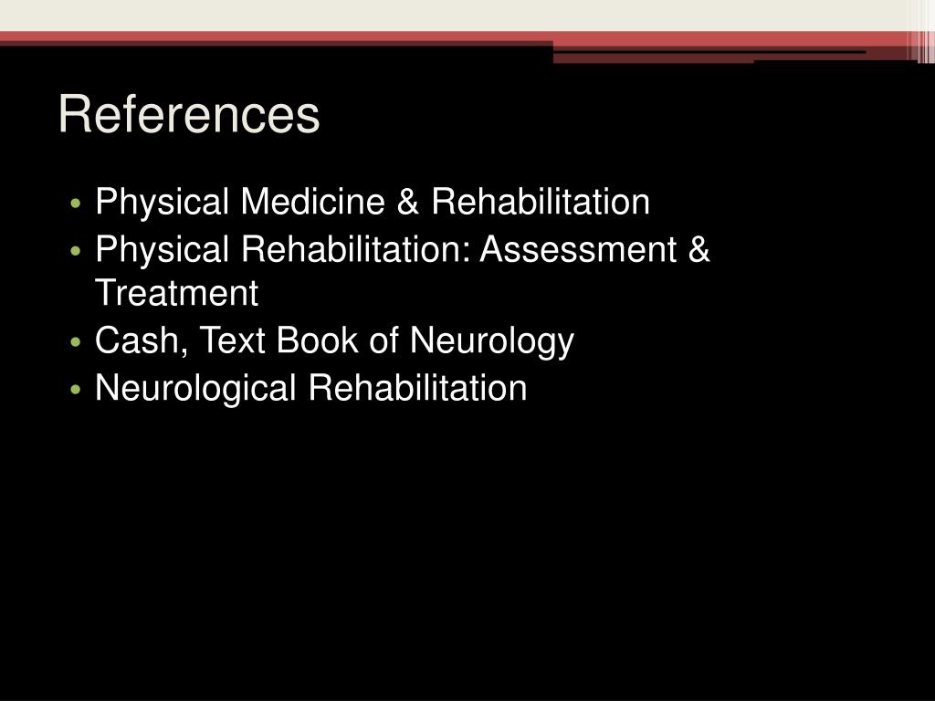 References • Physical Medicine & Rehabilitation • Physical Rehabilitation: Assessment & Treatment • Cash, Text Book of Neurology • Neurological Rehabilitation