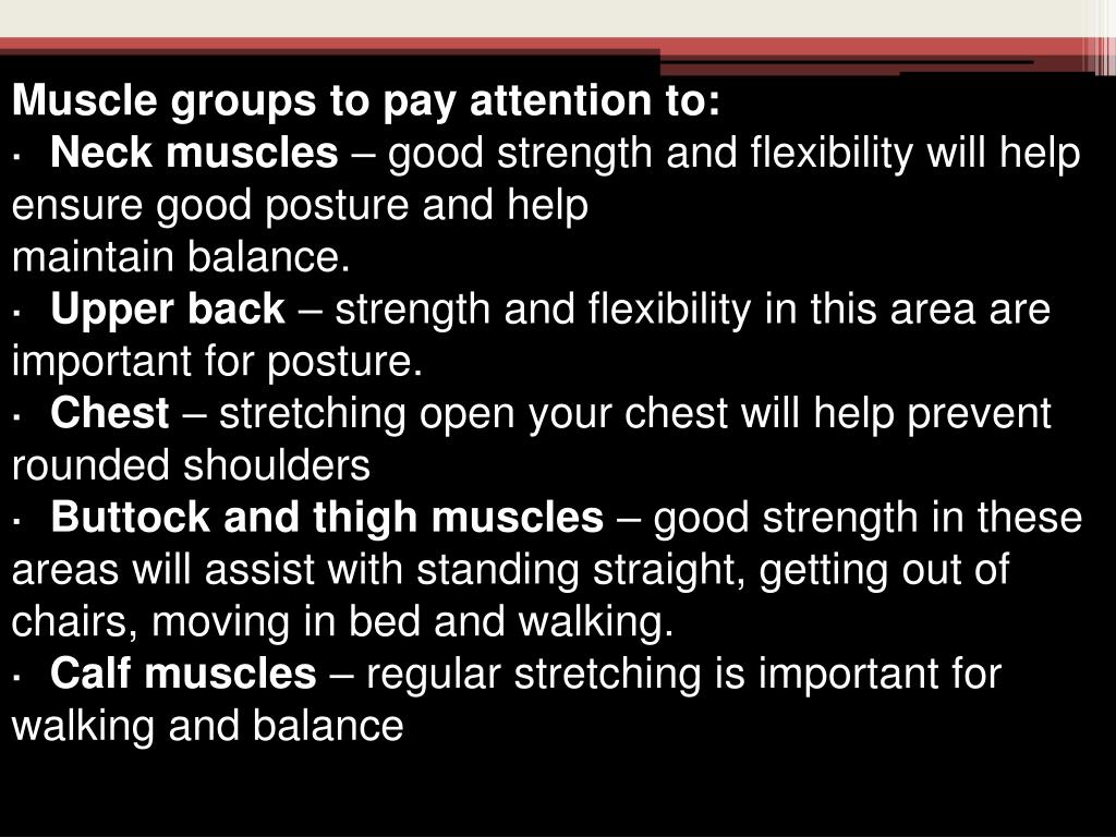 Muscle groups to pay attention to: · Neck muscles – good strength and flexibility will help ensure good posture and help maintain balance. · Upper back – strength and flexibility in this area are important for posture. · Chest – stretching open your chest will help prevent rounded shoulders · Buttock and thigh muscles – good strength in these areas will assist with standing straight, getting out of chairs, moving in bed and walking. · Calf muscles – regular stretching is important for walking and balance
