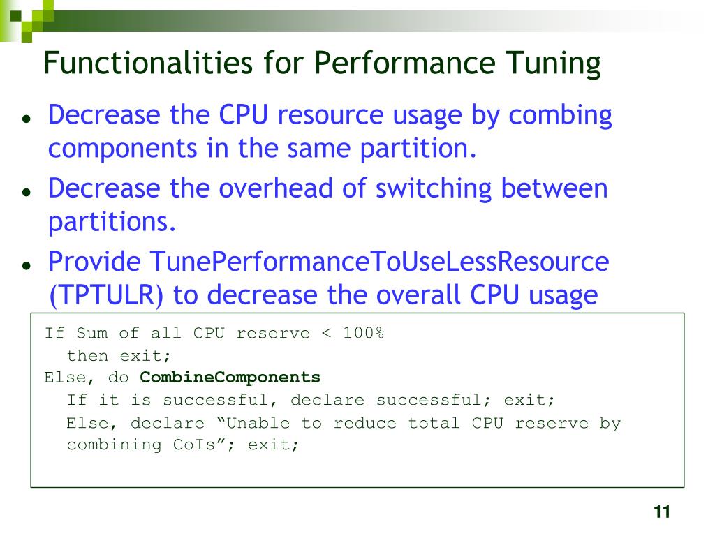 Functionalities for Performance Tuning • Decrease the CPU resource usage by combing components in the same partition. • Decrease the overhead of switching between partitions. • Provide TunePerformanceToUseLessResource (TPTULR) to decrease the overall CPU usage If Sum of all CPU reserve < 100% then exit; Else, do CombineComponents If it is successful, declare successful; exit; Else, declare “Unable to reduce total CPU reserve by combining CoIs”; exit;