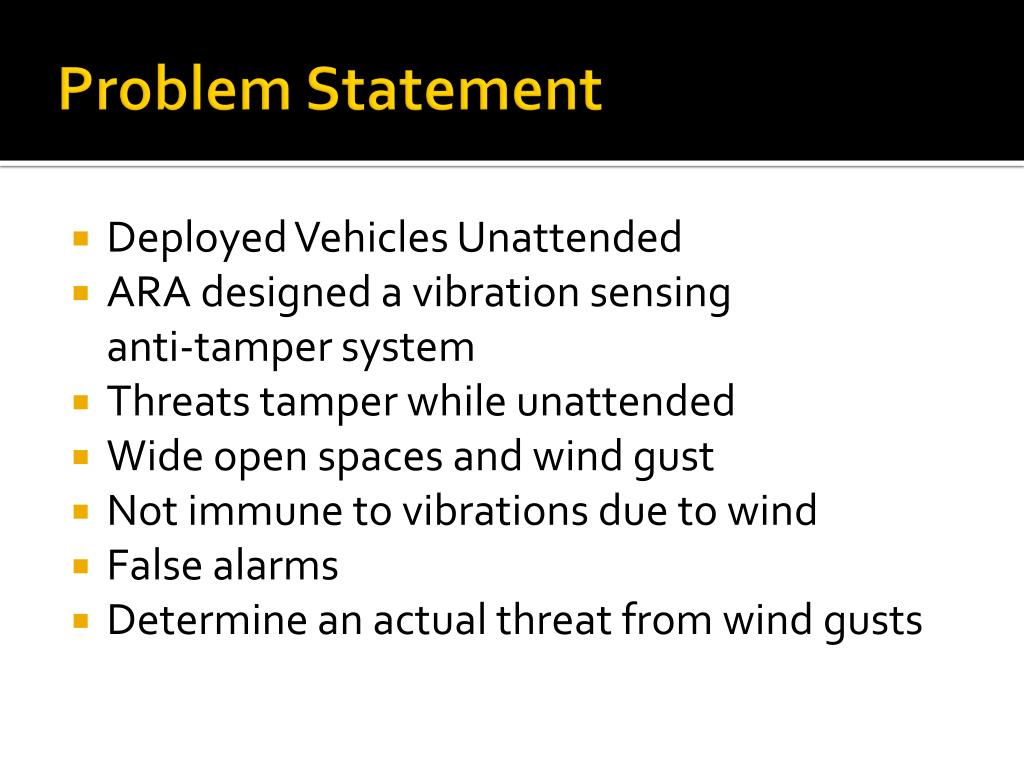 Problem Statement • Deployed Vehicles Unattended • ARA designed a vibration sensing anti-tamper system • Threats tamper while unattended • Wide open spaces and wind gust • Not immune to vibrations due to wind • False alarms • Determine an actual threat from wind gusts