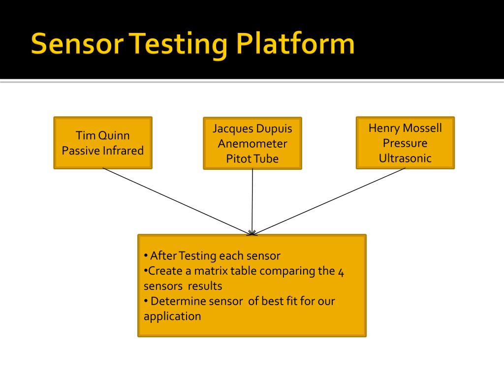 Sensor Testing Platform Tim Quinn Passive Infrared Henry Mossell Pressure Ultrasonic Jacques Dupuis Anemometer Pitot Tube • After Testing each sensor • Create a matrix table comparing the 4 sensors results • Determine sensor of best fit for our application