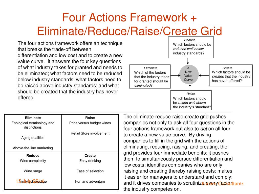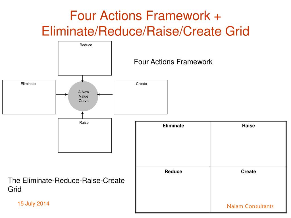 Four Actions Framework + Eliminate/Reduce/Raise/Create Grid Reduce Four Actions Framework Eliminate Create A New Value Curve Raise The Eliminate-Reduce-Raise-Create Grid Nalam Consultants