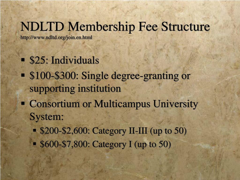 NDLTD Membership Fee Structurehttp://www.ndltd.org/join.en.html • $25: Individuals • $100-$300: Single degree-granting or supporting institution • Consortium or Multicampus University System: • $200-$2,600: Category II-III (up to 50) • $600-$7,800: Category I (up to 50)
