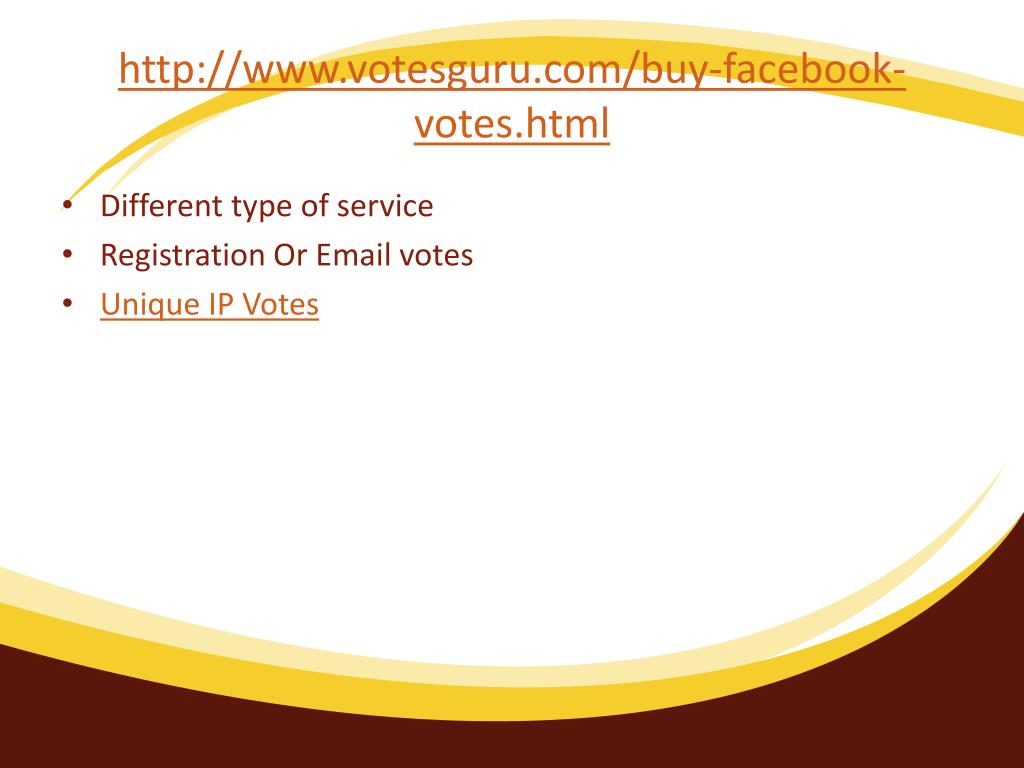 http://www.votesguru.com/buy-facebook-votes.html • Different type of service • Registration Or Email votes • Unique IP Votes