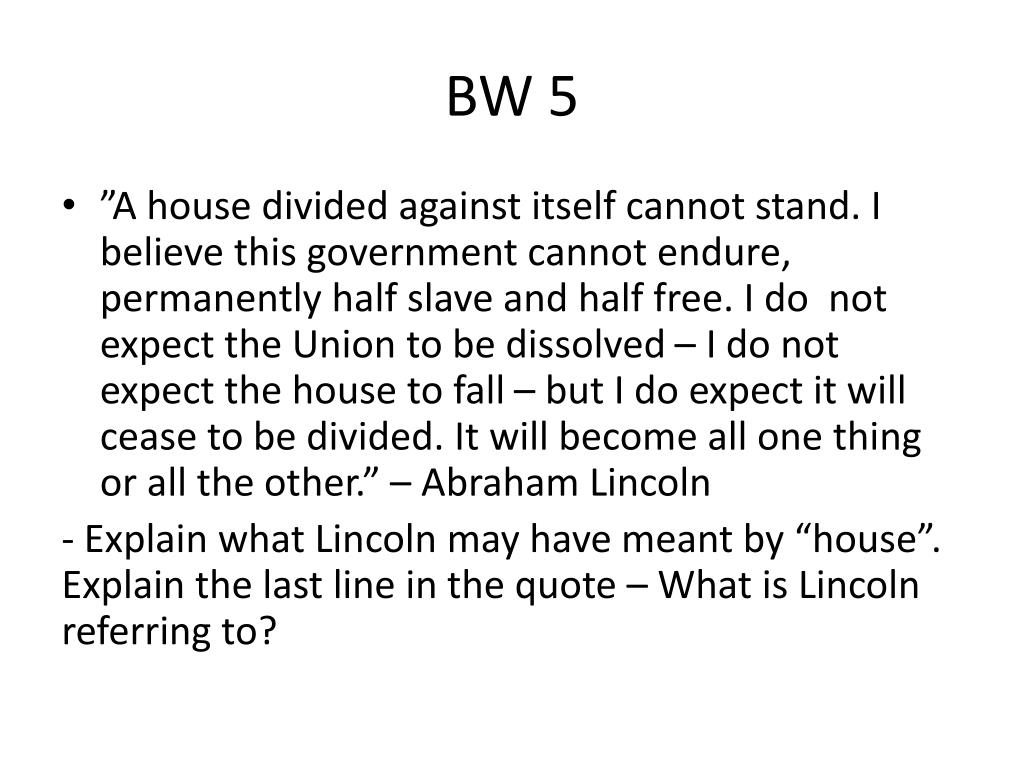 BW 5 • ”A house divided against itself cannot stand. I believe this government cannot endure, permanently half slave and half free. I do not expect the Union to be dissolved – I do not expect the house to fall – but I do expect it will cease to be divided. It will become all one thing or all the other.” – Abraham Lincoln - Explain what Lincoln may have meant by “house”. Explain the last line in the quote – What is Lincoln referring to?