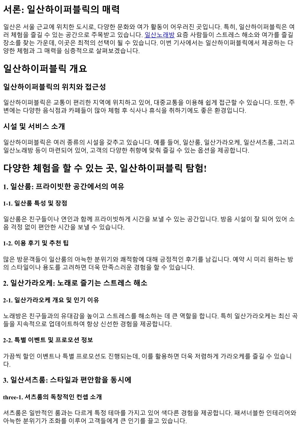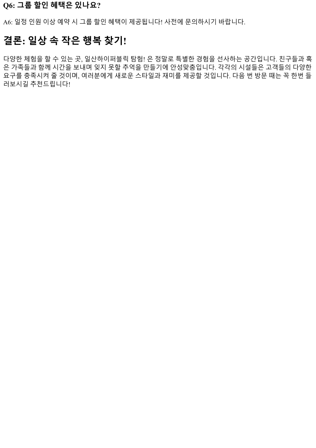 3. Q6: 그룹할인혜택은있나요? A6: 일정인원이상예약시그룹할인혜택이제공됩니다! 사전에문의하시기바랍니다. 결론: 일상속작은행복찾기! 다양한체험을할수있는곳, 일산하이퍼블릭탐험! 은정말로특별한경험을선사하는공간입니다. 친구들과혹 은가족들과함께시간을보내며잊지못할추억을만들기에안성맞춤입니다. 각각의시설들은고객들의다양한 요구를충족시켜줄것이며, 여러분에게새로운스타일과재미를제공할것입니다. 다음번방문때는꼭한번들 러보시길추천드립니다!