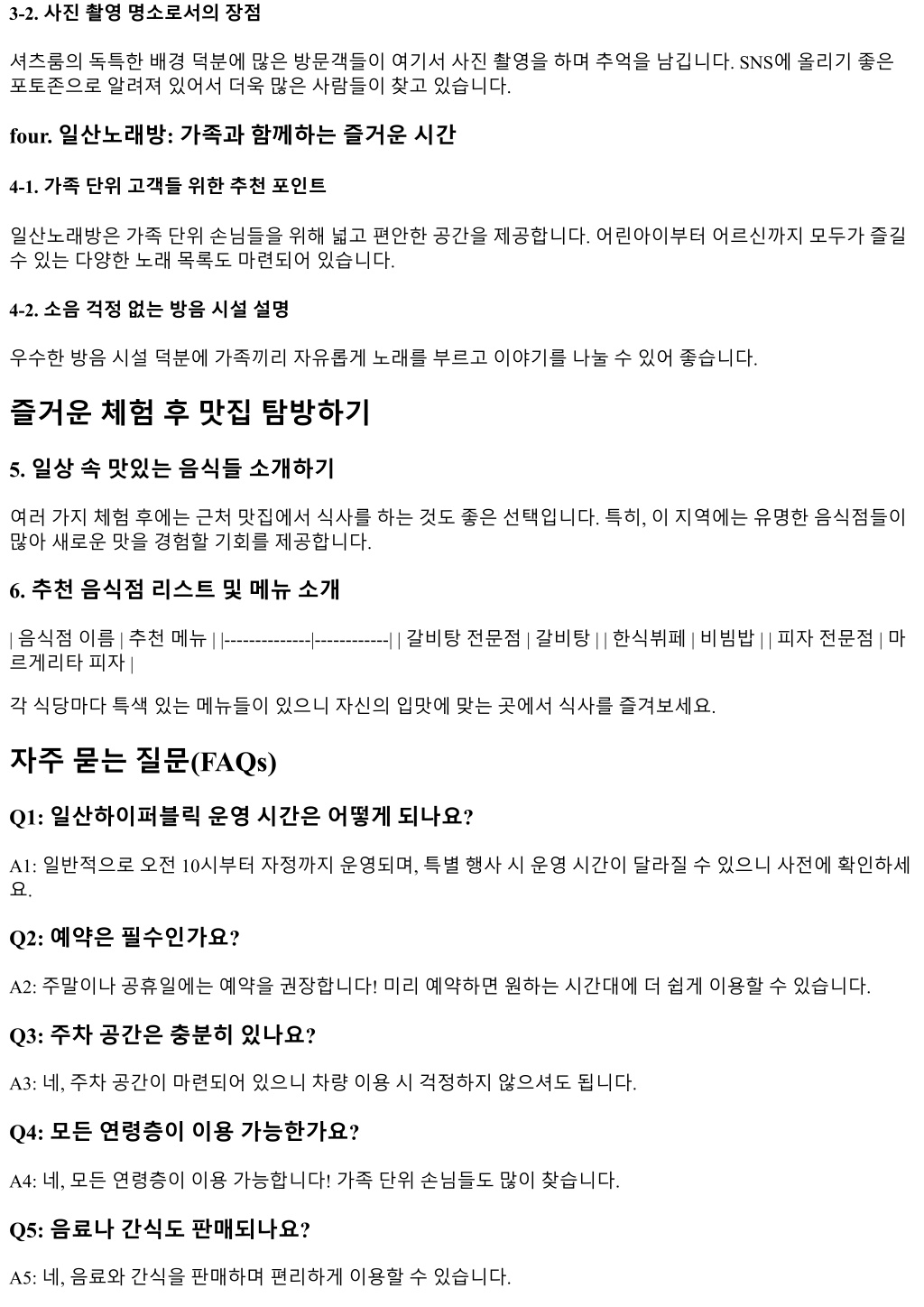 2. 3-2. 사진촬영명소로서의장점 셔츠룸의독특한배경덕분에많은방문객들이여기서사진촬영을하며추억을남깁니다. SNS에올리기좋은 포토존으로알려져있어서더욱많은사람들이찾고있습니다. four. 일산노래방: 가족과함께하는즐거운시간 4-1. 가족단위고객들위한추천포인트 일산노래방은가족단위손님들을위해넓고편안한공간을제공합니다. 어린아이부터어르신까지모두가즐길 수있는다양한노래목록도마련되어있습니다. 4-2. 소음걱정없는방음시설설명 우수한방음시설덕분에가족끼리자유롭게노래를부르고이야기를나눌수있어좋습니다. 즐거운체험후맛집탐방하기 5. 일상속맛있는음식들소개하기 여러가지체험후에는근처맛집에서식사를하는것도좋은선택입니다. 특히, 이지역에는유명한음식점들이 많아새로운맛을경험할기회를제공합니다. 6. 추천음식점리스트및메뉴소개 | 음식점이름 | 추천메뉴 | |--------------|------------| | 갈비탕전문점 | 갈비탕 | | 한식뷔페 | 비빔밥 | | 피자전문점 | 마 르게리타피자 | 각식당마다특색있는메뉴들이있으니자신의입맛에맞는곳에서식사를즐겨보세요. 자주묻는질문(FAQs) Q1: 일산하이퍼블릭운영시간은어떻게되나요? A1: 일반적으로오전 10시부터자정까지운영되며, 특별행사시운영시간이달라질수있으니사전에확인하세 요. Q2: 예약은필수인가요? A2: 주말이나공휴일에는예약을권장합니다! 미리예약하면원하는시간대에더쉽게이용할수있습니다. Q3: 주차공간은충분히있나요? A3: 네, 주차공간이마련되어있으니차량이용시걱정하지않으셔도됩니다. Q4: 모든연령층이이용가능한가요? A4: 네, 모든연령층이이용가능합니다! 가족단위손님들도많이찾습니다. Q5: 음료나간식도판매되나요? A5: 네, 음료와간식을판매하며편리하게이용할수있습니다.