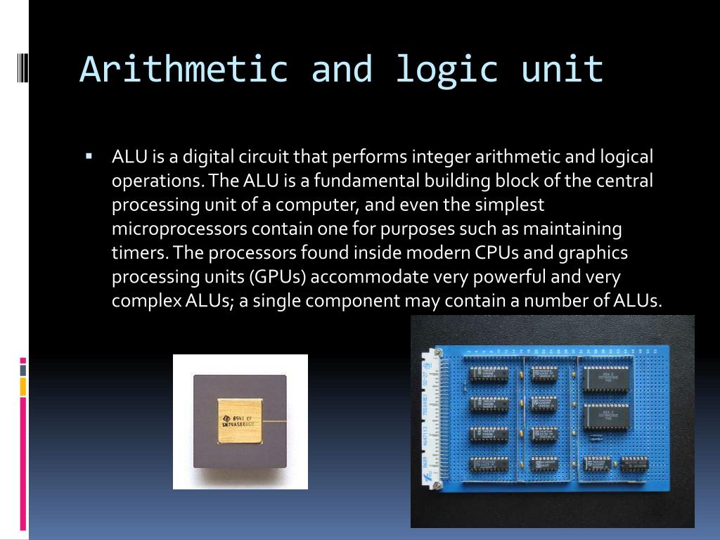 Arithmetic and logicunit • ALU is a digital circuit that performs integer arithmetic and logical operations. The ALU is a fundamental building block of the central processing unit of a computer, and even the simplest microprocessors contain one for purposes such as maintaining timers. The processors found inside modern CPUs and graphics processing units (GPUs) accommodate very powerful and very complex ALUs; a single component may contain a number of ALUs.