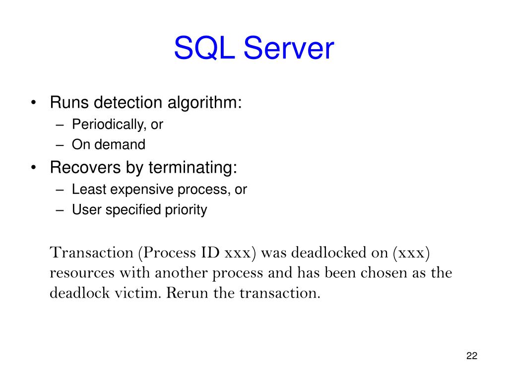 SQL Server • Runs detection algorithm: • Periodically, or • On demand • Recovers by terminating: • Least expensive process, or • User specified priority Transaction (Process ID xxx) was deadlocked on (xxx) resources with another process and has been chosen as the deadlock victim. Rerun the transaction.