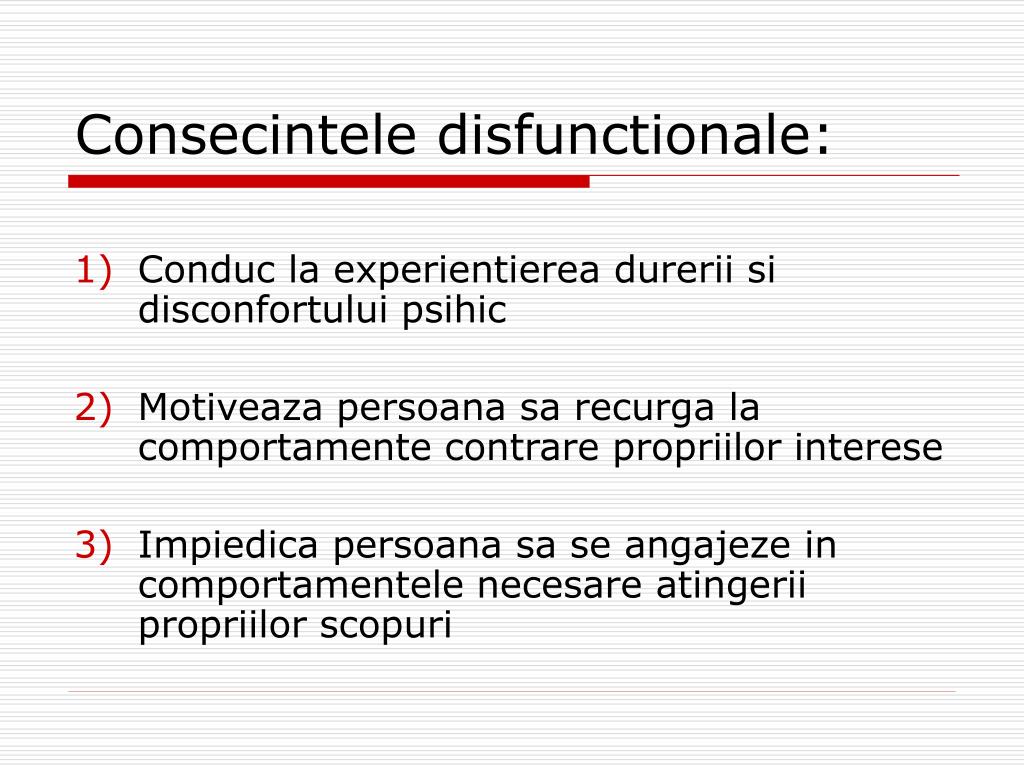 Consecintele disfunctionale: • Conduc la experientierea durerii si disconfortului psihic • Motiveaza persoana sa recurga la comportamente contrare propriilor interese • Impiedica persoana sa se angajeze in comportamentele necesare atingerii propriilor scopuri