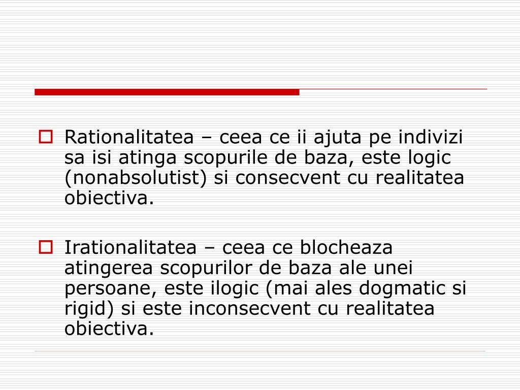Rationalitatea – ceea ce ii ajuta pe indivizi sa isi atinga scopurile de baza, este logic (nonabsolutist) si consecvent cu realitatea obiectiva. • Irationalitatea – ceea ce blocheaza atingerea scopurilor de baza ale unei persoane, este ilogic (mai ales dogmatic si rigid) si este inconsecvent cu realitatea obiectiva.