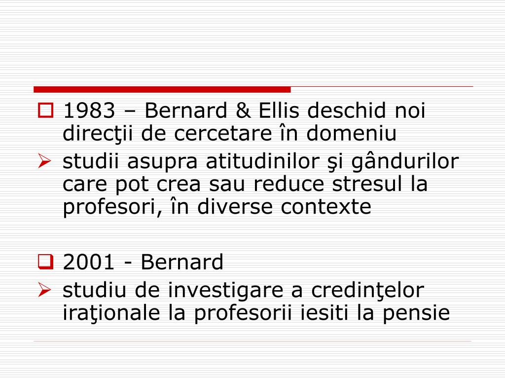 1983 – Bernard & Ellis deschid noi direcţii de cercetare în domeniu • studii asupra atitudinilor şi gândurilor care pot crea sau reduce stresul la profesori, în diverse contexte • 2001 - Bernard • studiu de investigare a credinţelor iraţionale la profesorii iesiti la pensie