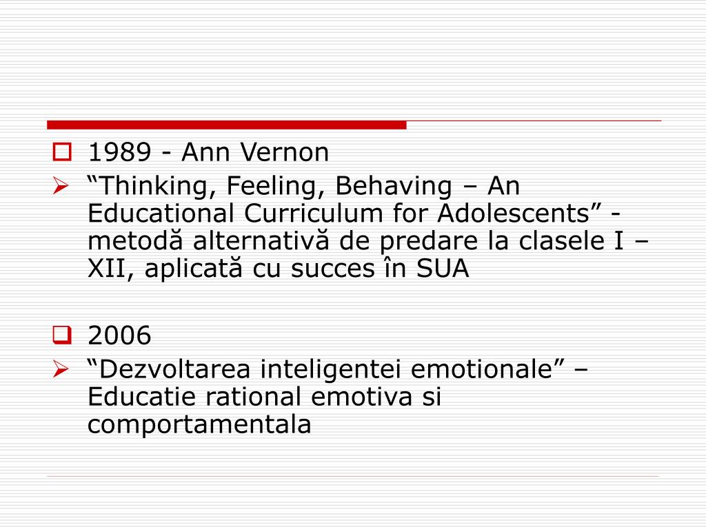1989 - Ann Vernon • “Thinking, Feeling, Behaving – An Educational Curriculum for Adolescents” - metodă alternativă de predare la clasele I – XII, aplicată cu succes în SUA • 2006 • “Dezvoltarea inteligentei emotionale” – Educatie rational emotiva si comportamentala