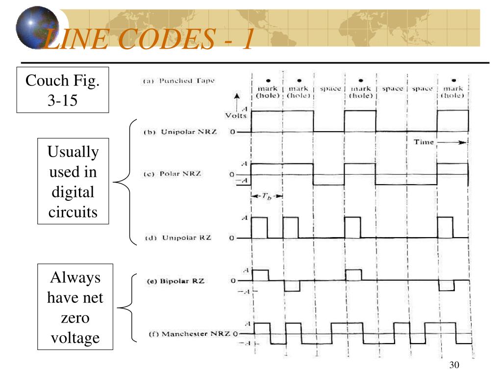 LINE CODES - 1 Couch Fig. 3-15 Usually used in digital circuits Always have net zero voltage