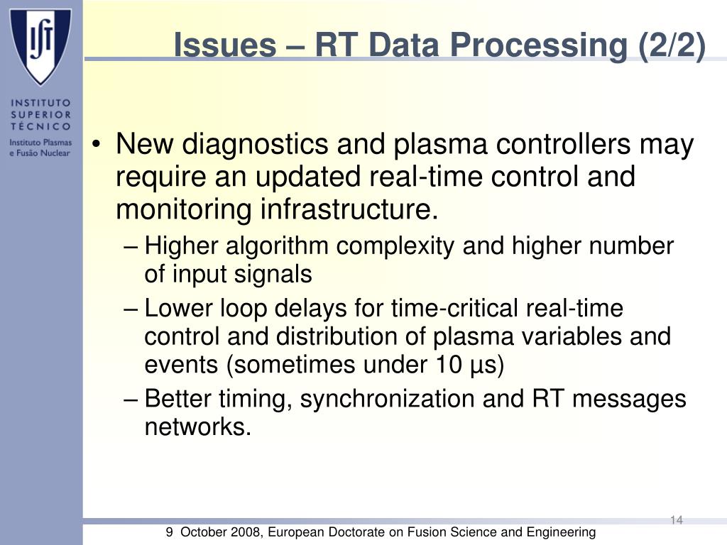9 October 2008, European Doctorate on Fusion Science and Engineering Issues – RT Data Processing (2/2) • New diagnostics and plasma controllers may require an updated real-time control and monitoring infrastructure. • Higher algorithm complexity and higher number of input signals • Lower loop delays for time-critical real-time control and distribution of plasma variables and events (sometimes under 10 µs) • Better timing, synchronization and RT messages networks.