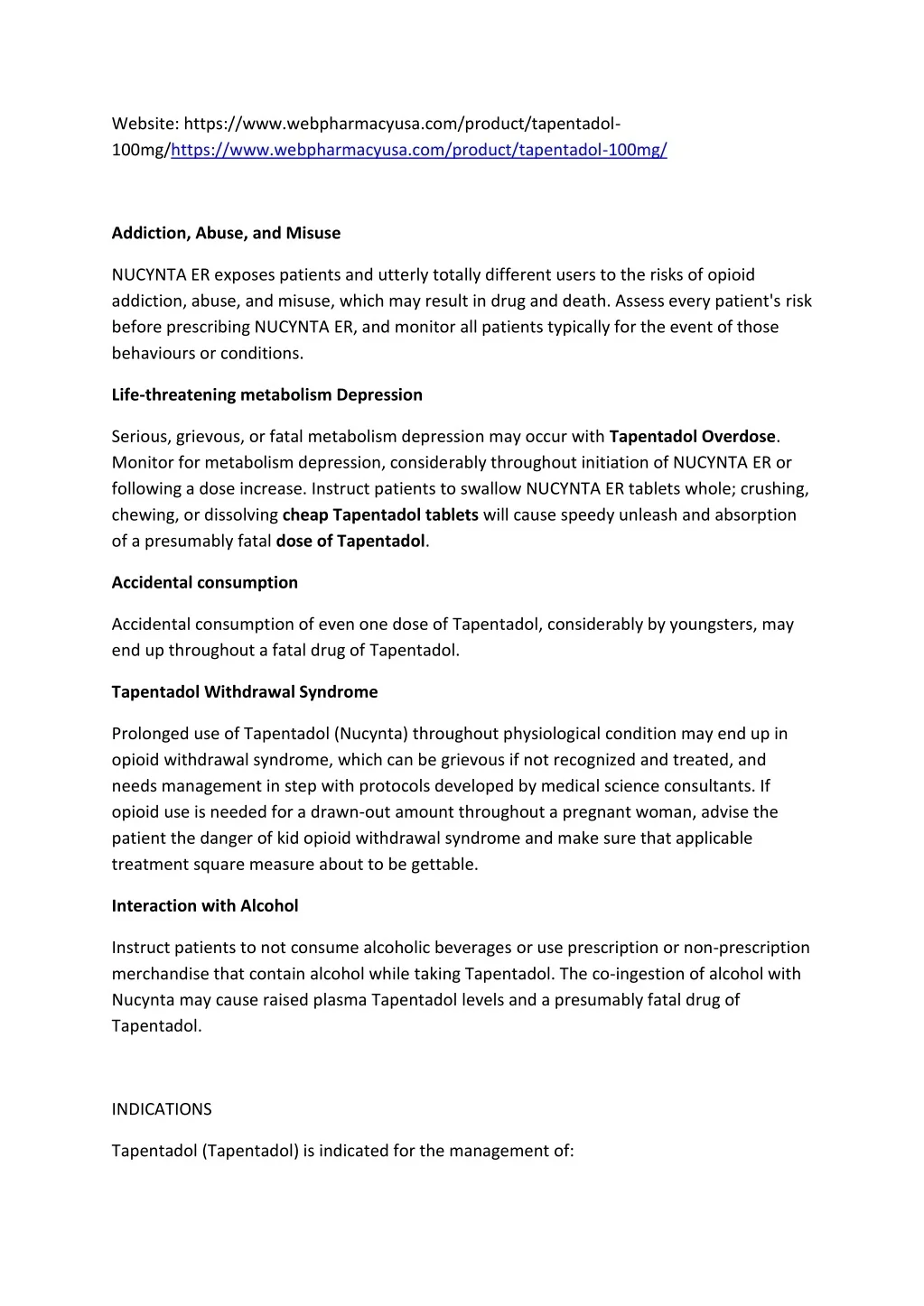 Website: https://www.webpharmacyusa.com/product/tapentadol- 100mg/https://www.webpharmacyusa.com/product/tapentadol-100mg/ Addiction, Abuse, and Misuse NUCYNTA ER exposes patients and utterly totally different users to the risks of opioid addiction, abuse, and misuse, which may result in drug and death. Assess every patient's risk before prescribing NUCYNTA ER, and monitor all patients typically for the event of those behaviours or conditions. Life-threatening metabolism Depression Serious, grievous, or fatal metabolism depression may occur with Tapentadol Overdose. Monitor for metabolism depression, considerably throughout initiation of NUCYNTA ER or following a dose increase. Instruct patients to swallow NUCYNTA ER tablets whole; crushing, chewing, or dissolving cheap Tapentadol tablets will cause speedy unleash and absorption of a presumably fatal dose of Tapentadol. Accidental consumption Accidental consumption of even one dose of Tapentadol, considerably by youngsters, may end up throughout a fatal drug of Tapentadol. Tapentadol Withdrawal Syndrome Prolonged use of Tapentadol (Nucynta) throughout physiological condition may end up in opioid withdrawal syndrome, which can be grievous if not recognized and treated, and needs management in step with protocols developed by medical science consultants. If opioid use is needed for a drawn-out amount throughout a pregnant woman, advise the patient the danger of kid opioid withdrawal syndrome and make sure that applicable treatment square measure about to be gettable. Interaction with Alcohol Instruct patients to not consume alcoholic beverages or use prescription or non-prescription merchandise that contain alcohol while taking Tapentadol. The co-ingestion of alcohol with Nucynta may cause raised plasma Tapentadol levels and a presumably fatal drug of Tapentadol. INDICATIONS Tapentadol (Tapentadol) is indicated for the management of: