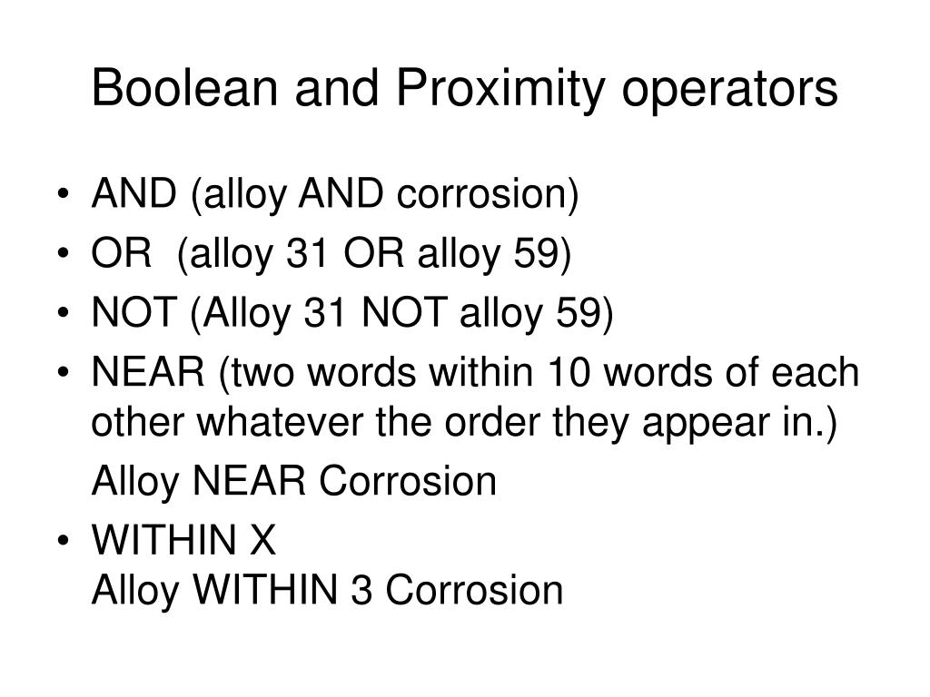 Boolean and Proximity operators. AND (alloy AND corrosion) OR (alloy 31 OR alloy 59) NOT (Alloy 31 NOT alloy 59) NEAR (two words within 10 words of each other whatever the order they appear in.) Alloy NEAR Corrosion WITHIN X Alloy WITHIN 3 Corrosion. American Fisheries Society