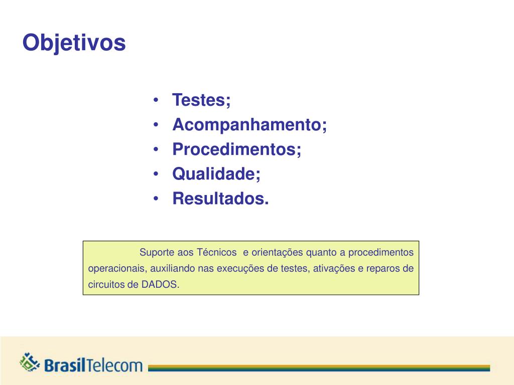 Objetivos • Testes; • Acompanhamento; • Procedimentos; • Qualidade; • Resultados. Suporte aos Técnicos e orientações quanto a procedimentos operacionais, auxiliando nas execuções de testes, ativações e reparos de circuitos de DADOS.