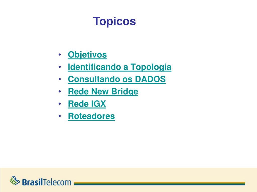 Topicos Topicos • Objetivos • Identificando a Topologia • Consultando os DADOS • Rede New Bridge • Rede IGX • Roteadores