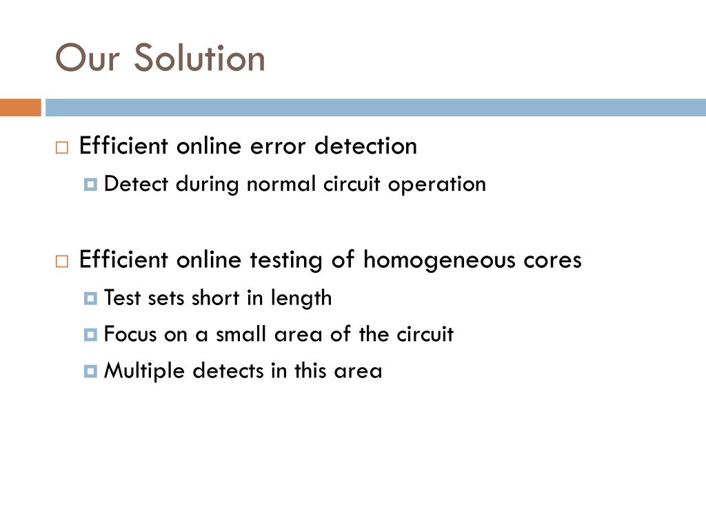 Our Solution • Efficient online error detection • Detect during normal circuit operation • Efficient online testing of homogeneous cores • Test sets short in length • Focus on a small area of the circuit • Multiple detects in this area