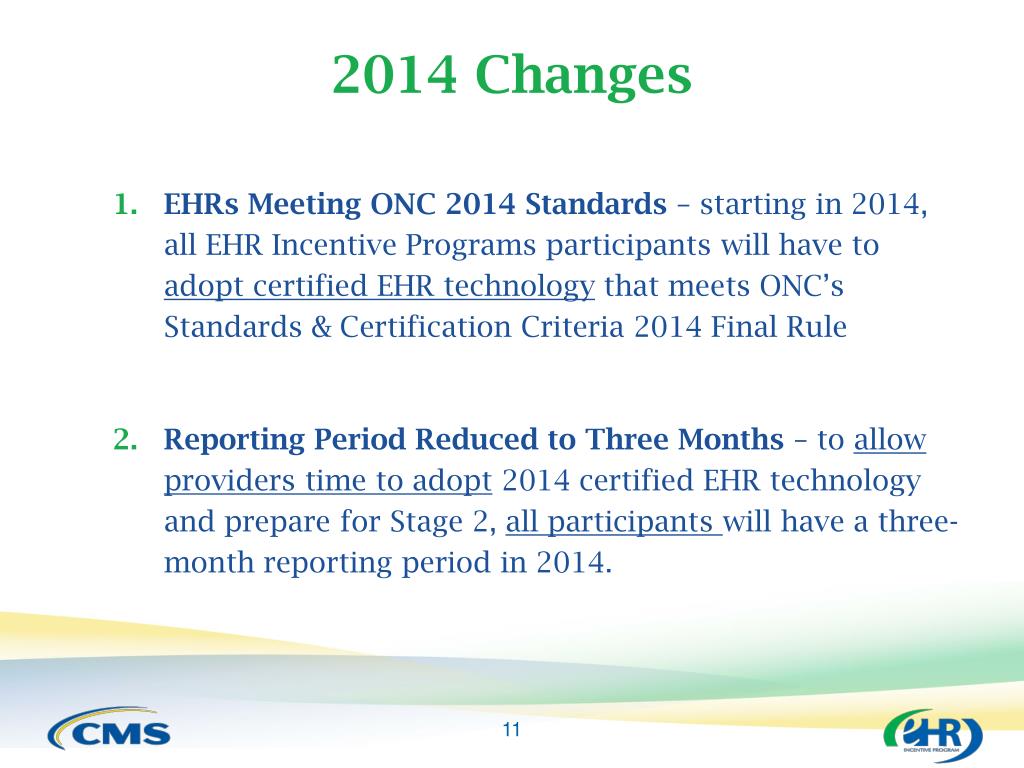 2014 Changes EHRs Meeting ONC 2014 Standards – starting in 2014, all EHR Incentive Programs participants will have to adopt certified EHR technologythat meets ONC’s Standards & Certification Criteria 2014 Final Rule Reporting Period Reduced to Three Months – to allow providers time to adopt 2014 certified EHR technology and prepare for Stage 2, all participants will have a three-month reporting period in 2014.