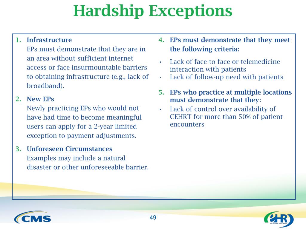 Hardship Exceptions • InfrastructureEPs must demonstrate that they are in an area without sufficient internet access or face insurmountable barriers to obtaining infrastructure (e.g., lack of broadband). • New EPsNewly practicing EPs who would not have had time to become meaningful users can apply for a 2-year limited exception to payment adjustments. • Unforeseen CircumstancesExamples may include a natural disaster or other unforeseeable barrier. • EPs must demonstrate that they meet the following criteria: • • Lack of face-to-face or telemedicine interaction with patients • • Lack of follow-up need with patients • EPs who practice at multiple locations must demonstrate that they: • • Lack of control over availability of CEHRT for more than 50% of patient encounters