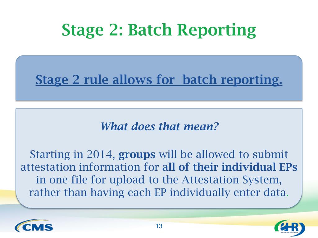 Stage 2: Batch Reporting • Stage 2 rule allows for batch reporting. • What does that mean? • Starting in 2014, groups will be allowed to submit attestation information for all of their individual EPs in one file for upload to the Attestation System, rather than having each EP individually enter data.