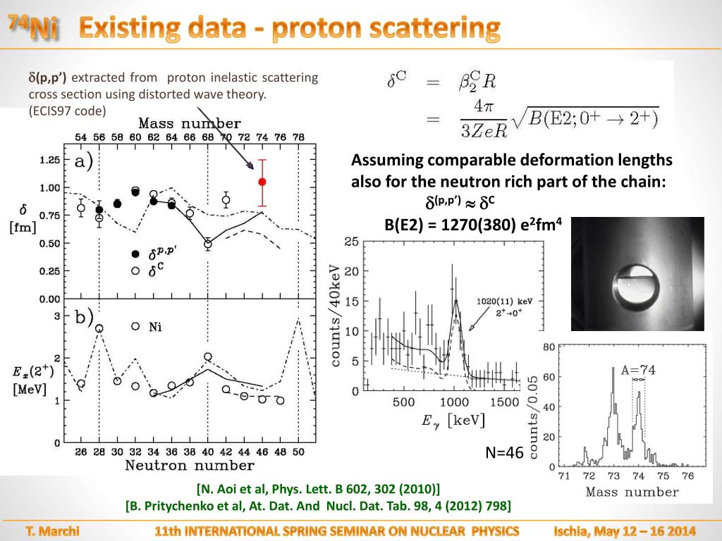 Existing data - proton scattering 74Ni (p,p’) extracted from proton inelastic scattering cross section using distorted wave theory. (ECIS97 code) Assuming comparable deformation lengths also for the neutron rich part of the chain: (p,p’) C B(E2) = 1270(380) e2fm4 N=46 [N. Aoi et al, Phys. Lett. B 602, 302 (2010)] [B. Pritychenko et al, At. Dat. And Nucl. Dat. Tab. 98, 4 (2012) 798] T. Marchi 11th INTERNATIONAL SPRING SEMINAR ON NUCLEAR PHYSICS Ischia, May 12 – 16 2014