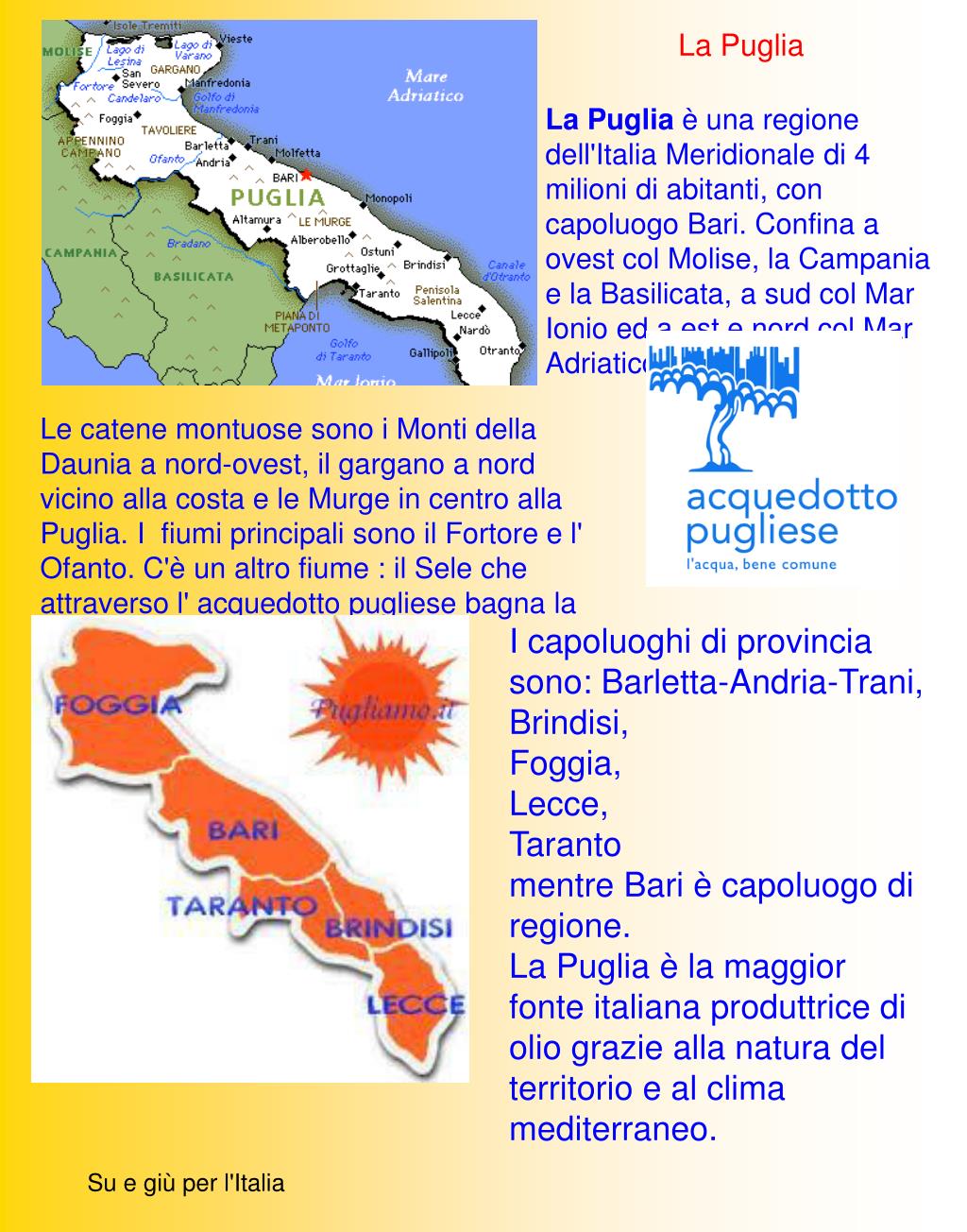 La Puglia La Puglia è una regione dell'Italia Meridionale di 4 milioni di abitanti, con capoluogo Bari. Confina a ovest col Molise, la Campania e la Basilicata, a sud col Mar Ionio ed a est e nord col Mar Adriatico. Le catene montuose sono i Monti della Daunia a nord-ovest, il gargano a nord vicino alla costa e le Murge in centro alla Puglia. I fiumi principali sono il Fortore e l' Ofanto. C'è un altro fiume : il Sele che attraverso l' acquedotto pugliese bagna la Puglia. I capoluoghi di provincia sono: Barletta-Andria-Trani, Brindisi, Foggia, Lecce, Taranto mentre Bari è capoluogo di regione. La Puglia è la maggior fonte italiana produttrice di olio grazie alla natura del territorio e al clima mediterraneo. Su e giù per l'Italia