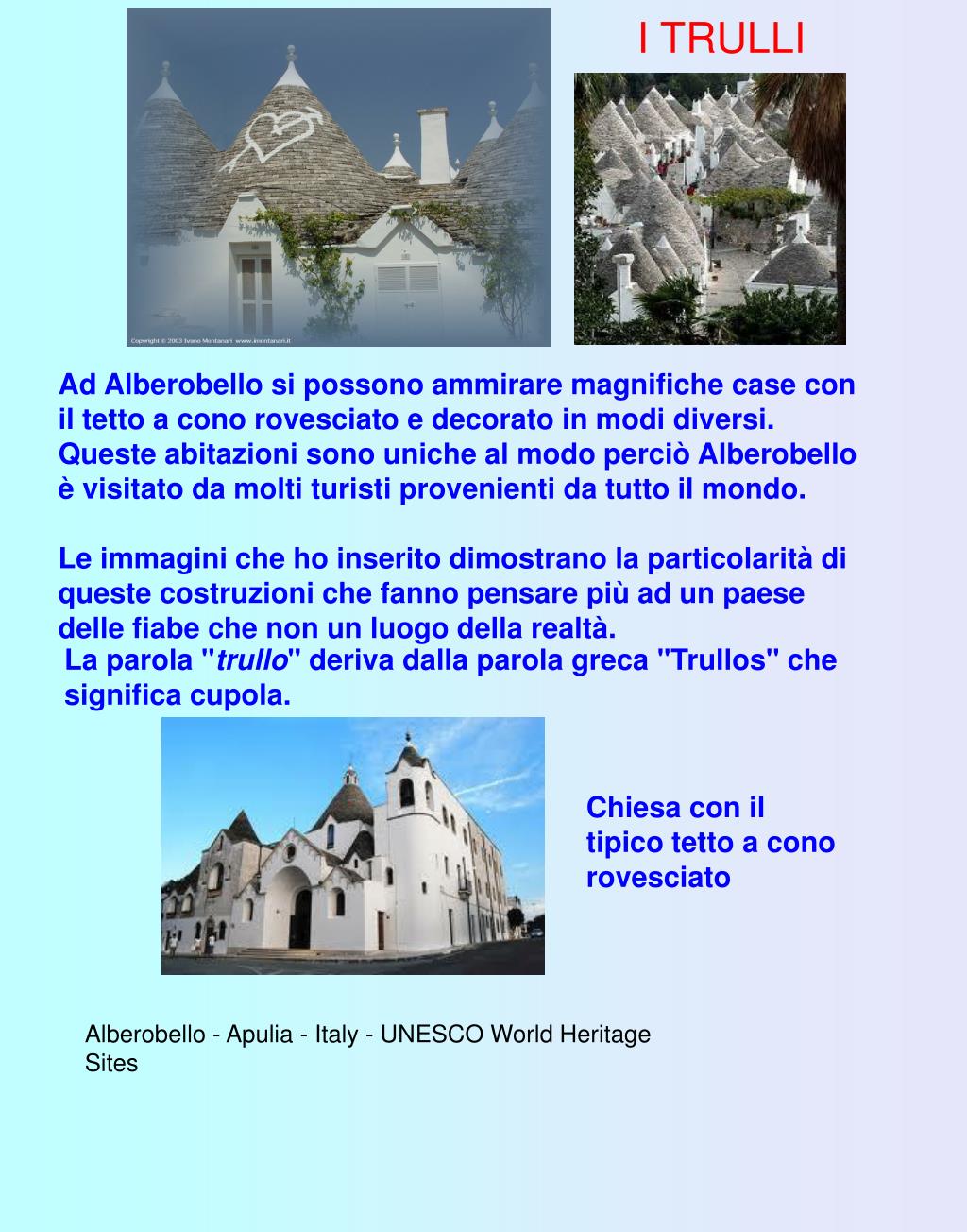 I TRULLI Ad Alberobello si possono ammirare magnifiche case con il tetto a cono rovesciato e decorato in modi diversi. Queste abitazioni sono uniche al modo perciò Alberobello è visitato da molti turisti provenienti da tutto il mondo. Le immagini che ho inserito dimostrano la particolarità di queste costruzioni che fanno pensare più ad un paese delle fiabe che non un luogo della realtà. La parola "trullo" deriva dalla parola greca "Trullos" che significa cupola. Chiesa con il tipico tetto a cono rovesciato Alberobello - Apulia - Italy - UNESCO World Heritage Sites
