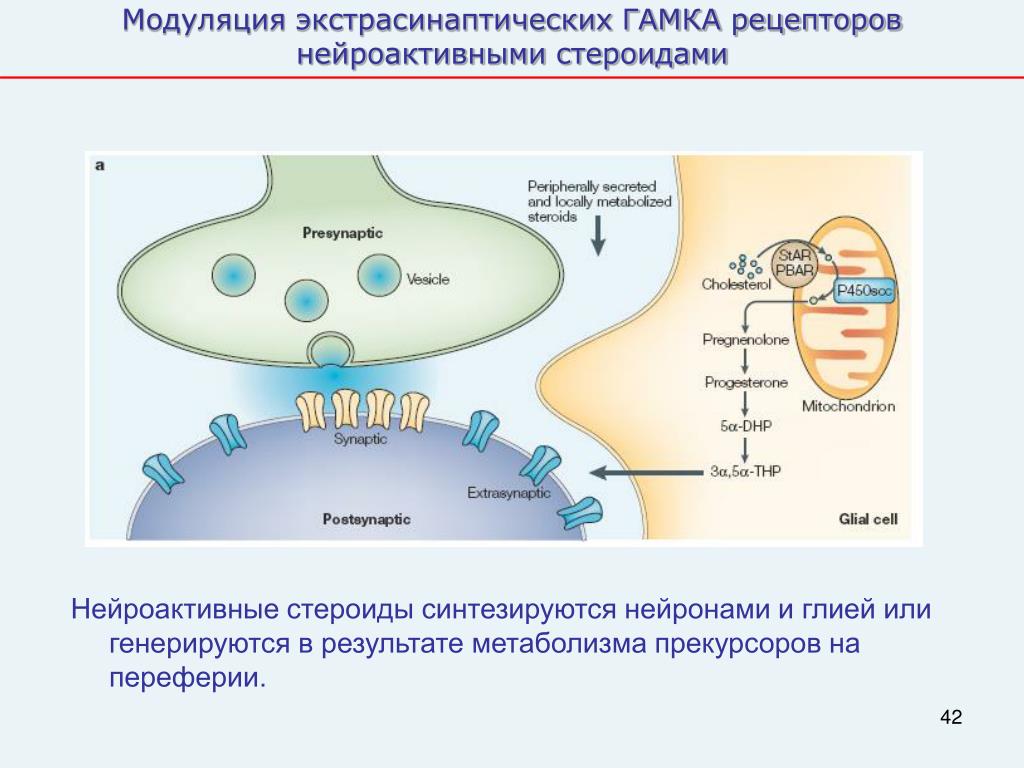 Модуляция экстрасинаптических ГАМКА рецепторов нейроактивными стероидами Нейроактивные стероиды синтезируются нейронами и глией или генерируются в результате метаболизма прекурсоров на переферии.