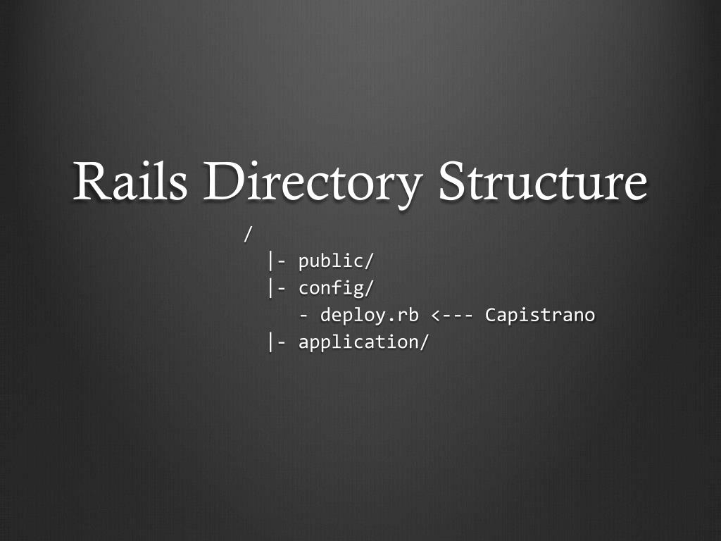 Rails Directory Structure / |- public/ |- config/ - deploy.rb <--- Capistrano |- application/
